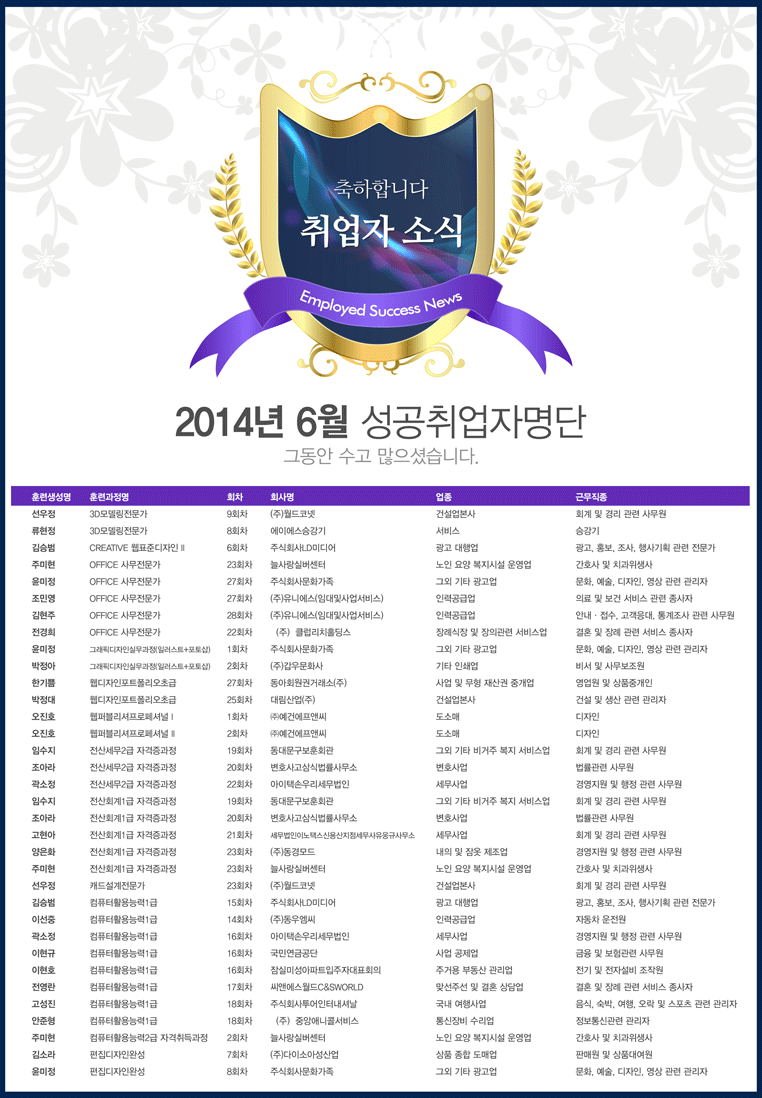 하이미디어컴퓨터학원 노원캠퍼스 2014년 6월 성공취업자 명단입니다.